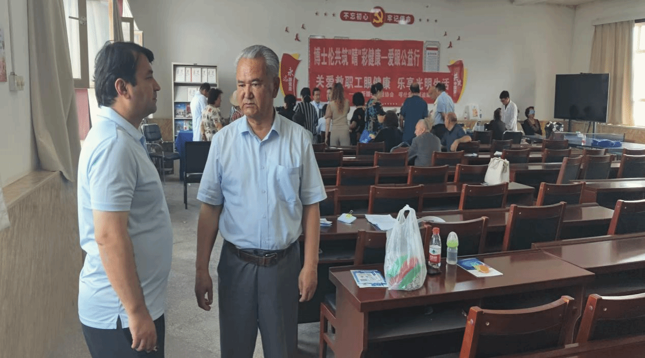 为贯彻落实“敬老、爱老、助老” 的服务宗旨,切实关心爱护保障退休教职工的眼部健康,提升退休教职工群体的爱眼护眼意识及眼健康水平,离退休职工管理处携手喀什爱尔阿迪娅眼科医院,2025 年 5 月 28 日和29 日,分别在高台校区离退休职工活动室和学府小区离退休职工活动室,为退休教职工开展免费眼部体检活动。